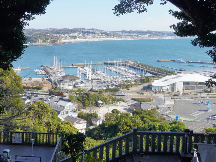 辺津宮をあとにして参道を進むと、視界が開けて対岸の江の島東浜や腰越のエリアを見渡す展望台に出ます。ここからは江の島のヨットハーバーも見渡し、青い海と白いヨットのコントラストがまぶしく映ります。この展望台から階段を上がった先が中津宮です。