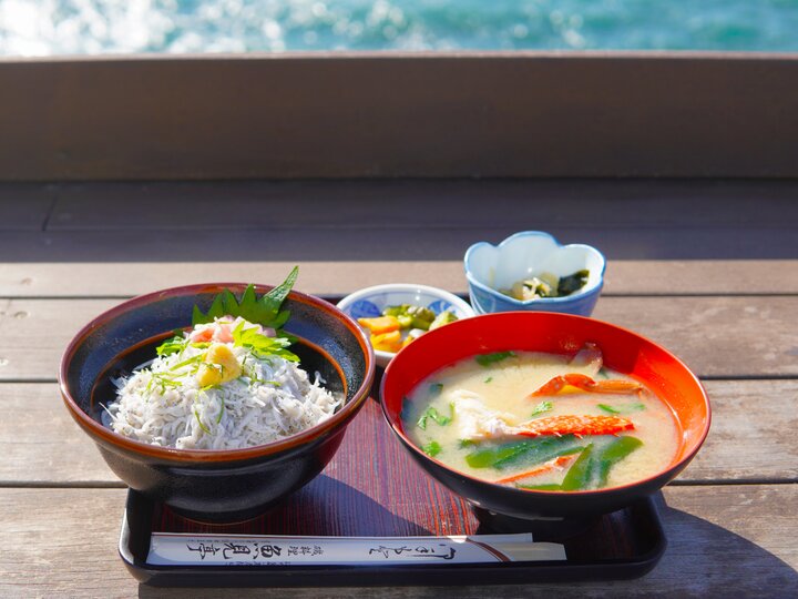 小あがりやテーブル席のどこからでも海が見えるほか、青い海が眼下に広がるテラスも心地よく過ごせます。初詣の時期におすすめの釜揚げシラス丼は、ふっくらと仕上げた温かいしらすがごはんの上にたっぷり。カニのお味噌汁と一緒に召し上がれ。