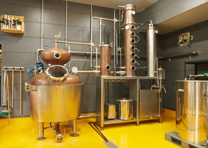大井倉蒸溜所にはシンボルとなる2基の蒸留器を設置。1基は連続式と単式の切り替えが可能なハイブリッド型の銅製蒸留器、もう1基は大型の釜の上にラム製造に合わせて設計された蒸留塔を取り付けた完全オリジナルの手作り蒸留器です。そのほかにも、収穫したサトウキビがラム酒になるまでのさまざまな設備を備えており、各設備をレシピに合わせて組み替えることで異なる味わいのラム酒を製造しています。