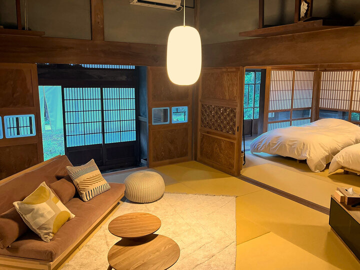 「大井倉宿せいざん」の室内は、元からある立派な太い梁や欄間、木材で出来た天井などはそのまま残しつつも、洗練されたインテリアが魅力。やわらかで暖かみのある家具は木の温もりと相まって心地よい空間が広がります。歴史を感じる建物や家具に囲まれて、非日常の体験を過ごしてみてくださいね。