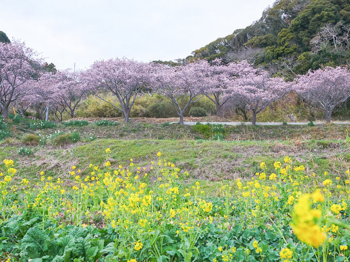 南房総市和田町にある「抱湖園」は、安房で初めて花栽培に成功した間宮七郎平が山を切り開いて造った庭園。毎年1月下旬から2月下旬には、旧暦の元旦の朝から「元朝桜」と呼ばれる寒桜と菜の花が咲き始めます。高台からは、花栽培のビニールハウスや太平洋に広がる海岸が見渡せ、美しい外房の眺めも望めます。そろそろ見頃を迎える「元朝桜」を見に南房総市に訪れてみませんか。