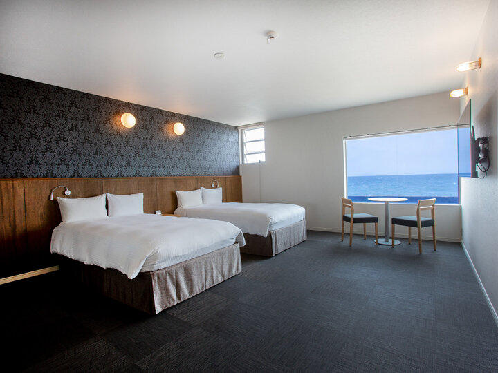 鴨川市の海岸沿いに佇む「波太オルビス」は、1日3組限定の「泊まれるレストラン」をコンセプトとしたオーベルジュです。宿泊できる部屋は、青空をイメージした青が基調の「sky」、夕日をイメージした赤が基調の「mare」、夜空をイメージした黒が基調のスイートルーム「stella」の3タイプがあり、全ての部屋はオーシャンビュー。圧巻のロケーションで開放感と癒しのひとときを過ごせます。