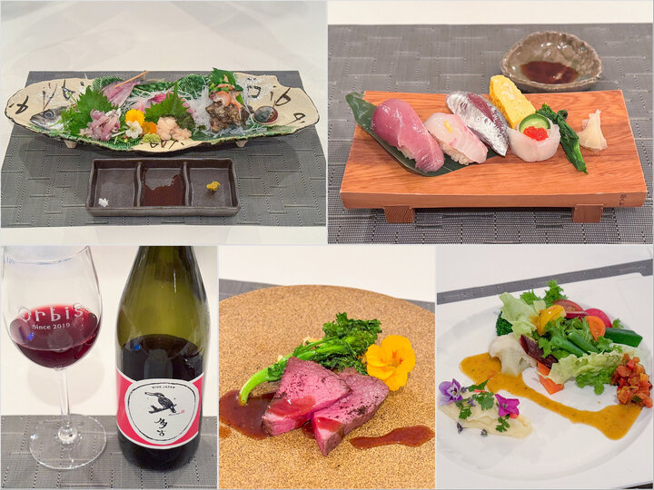 ディナーでは、寿司職人の大将とホテルニューオータニで修行したシェフの親子が作る、エディブルフラワーを使用したメニューや地産食材にこだわった和×洋のコラボレーションの食事を楽しめます。高梨牧場のかずさ和牛のお肉や大将が厳選した魚介類を使用したお寿司など、千葉・房総ならではの食材を使った料理はここでしか食べられない一皿。味噌や醤油、塩などの調味料も自家製と調味料にもこだわっています。現在はランチは休止中。ディナーは宿泊をしなくても利用することができます。