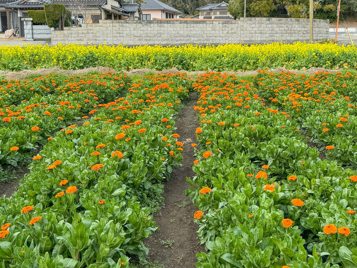 まるでオレンジのじゅうたんが敷かれているような美しいカレンデュラ畑