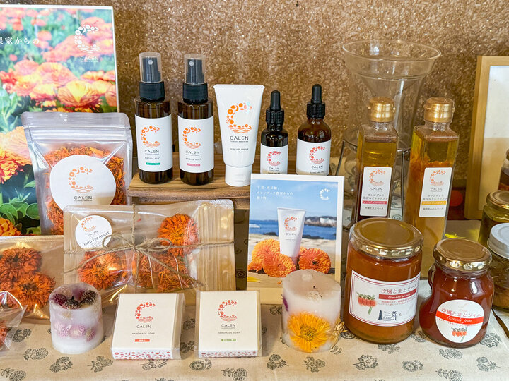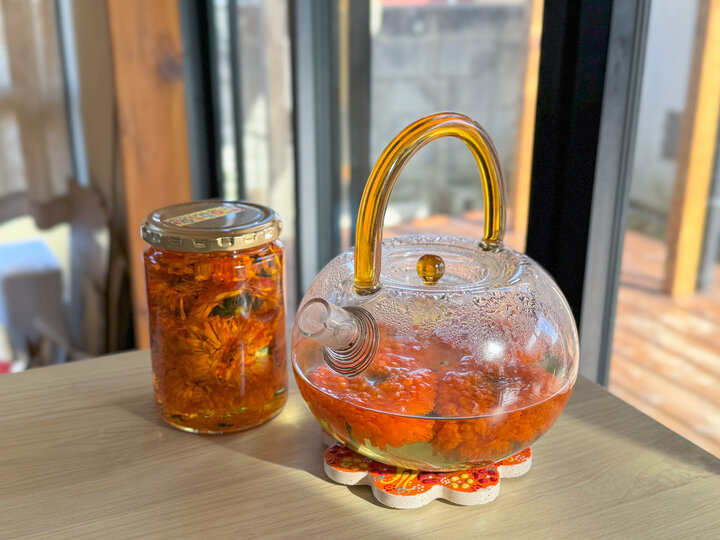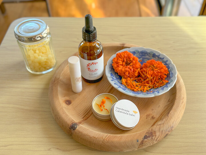 生コスメ作りを体験している時は、クレオパトラも愛したカレンデュラのハーブティーを飲んでリラックスしてみて。からだの内側で粘膜や胃の炎症を抑える効果や、発汗・解熱の作用もあるといわれており、風邪のひき始めなどに飲むのもおすすめです。 オンラインショップでは、自家製のカレンデュラオイルやハンドメイドソープ、まるごと一輪乾燥させたカレンデュラのハーブティーなども販売をしています。気になる方はチェックしてみて。
