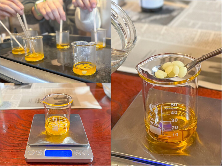花摘みをした後は、畑で摘んだ獲れたてのカレンデュラで生コスメ作りを体験。カレンデュラをオリーブオイルに漬け込んだ自家製のカレンデュラオイルと蜜蝋を使用して、リップバームとスキンケアバームを作ります。 カレンデュラは「皮膚のガードマン」とも呼ばれ、傷ついた皮膚や粘膜、血管を修復し保護してくれるほか、乾燥させた花びらをパスタに練りこんだり、サラダにかけたりさまざまな料理に活用することができるのだそう。
