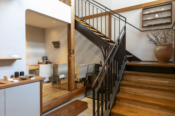 和情緒あふれる街でありながら、フレンチレストランが多い神楽坂。路地をのぞきながら、お店を探して歩くのも楽しみです。「HASABON」は、そんな街でフランス料理だけでなく抹茶を中心とした和文化も楽しめるお店。場所は東京メトロ神楽坂駅から徒歩2分ほど。細い路地の奥に、黒塀の雰囲気あるお店がひっそりと隠れています。のれんを分けて入れば、吹き抜けの空間が広がり、一気に視界が開けます。