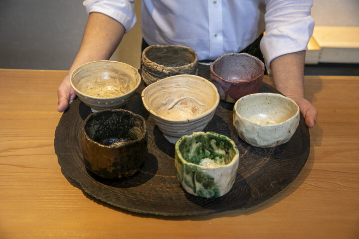 フランス料理の最後はコーヒーや紅茶をいただくのが定番ですが、抹茶で締めくくるのが「HASABON」流です。まずは好きな器を選びましょう。抹茶を点てて出してくれます。気軽に日本文化に親しむことができそうですね。