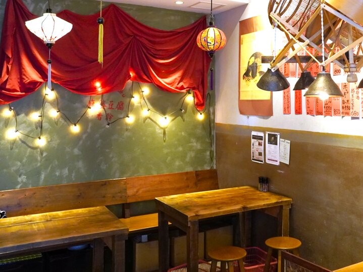 シンプルなテーブルと丸椅子が並ぶ店内はまるで台湾の屋台に訪れたかのようで、ノスタルジックな雰囲気につつまれます。あでやかな提灯がエキゾチックに彩ります。