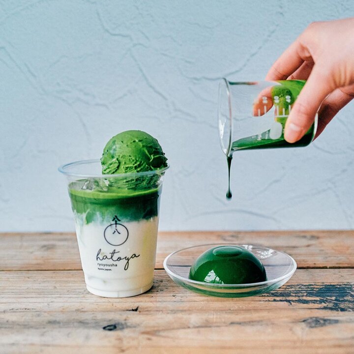 [実演]<⼋⼗⼋良葉舎> 抹茶ラテフロート無上 各⽇50点限り/⼋⼗⼋ゼリー 京都でも少ししか収穫されない⼿摘みの抹茶のみを使⽤し、抹茶本来の旨みをとことん追求した究極の抹茶ラテに同じ茶葉をふんだんに使って仕上げた無上抹茶アイスクリームをトッピングして、この上なく贅沢な仕上がりに。 さらに今回初登場の、⼿摘み抹茶のみで仕上げた旨み感じる⼋⼗⼋ゼリー。⼝の中で溶ける抹茶の味わいをぜひ⼀緒に楽しんで。