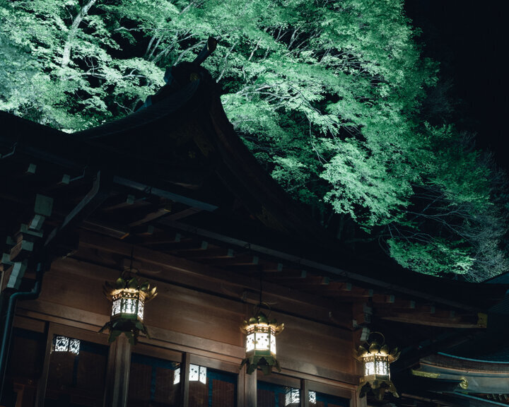 約3000本のもみじが境内を覆う貴船神社は、古来から新緑の名所としても知られています。 5月2日からの4日間は、本宮の参道である石段の灯籠や龍船閣などの新緑ライトアップが期間限定で開催。青もみじを背景に宵の闇に浮かび上がる境内では、静謐な空間がいっそう幻想的に感じられます。