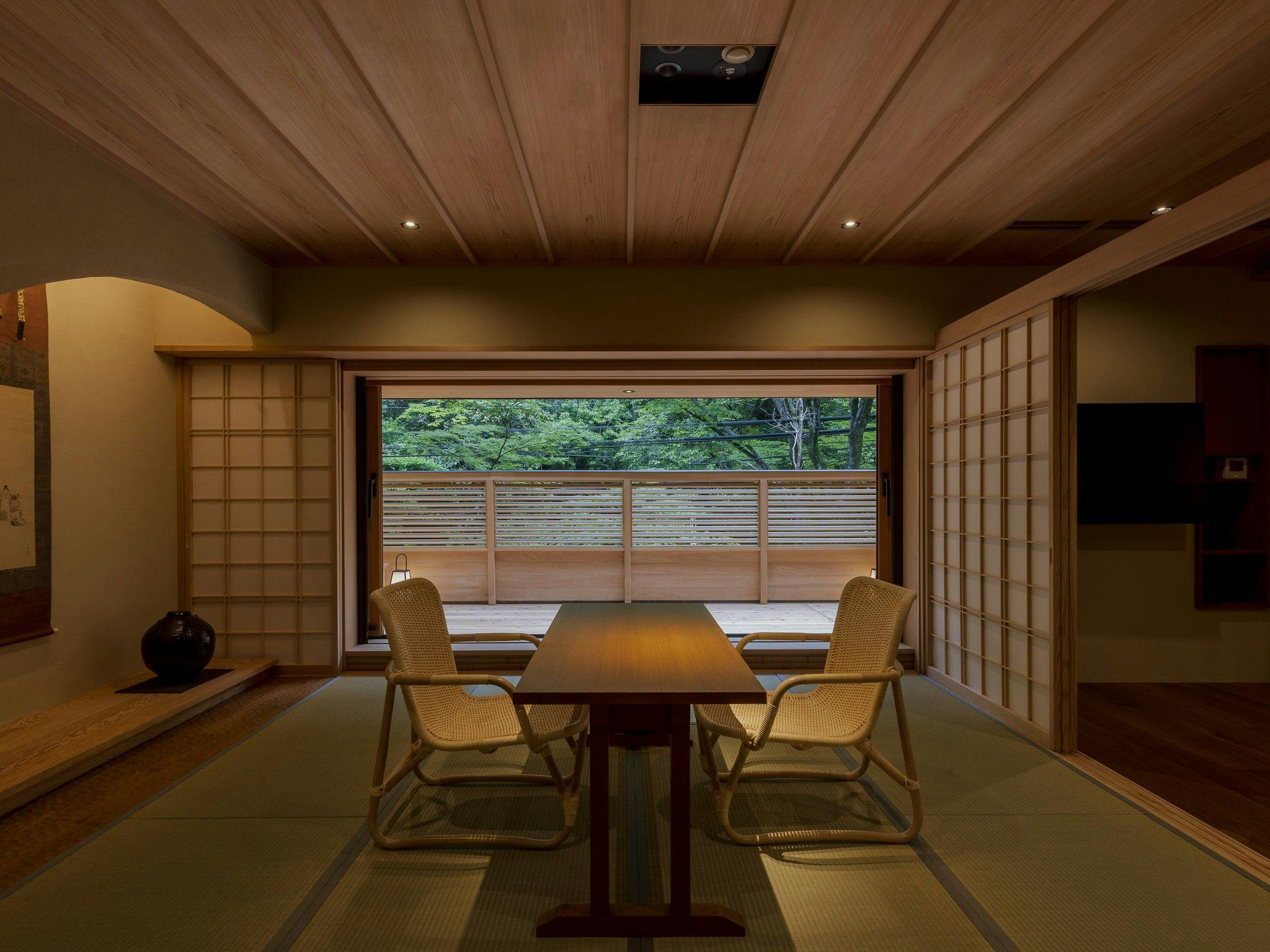 都内からフライトで2時間弱。抜群のアクセスの良さとは裏腹に、青々と茂った霧島の自然深い木々に完璧に溶け込む美しい宿「忘れの里 雅叙苑」。天降川沿いの敷地に茅葺屋根の古民家を移築した離れ家形式のお部屋がたった8室。全客室に100%源泉かけ流しの温泉風呂が備わっています。