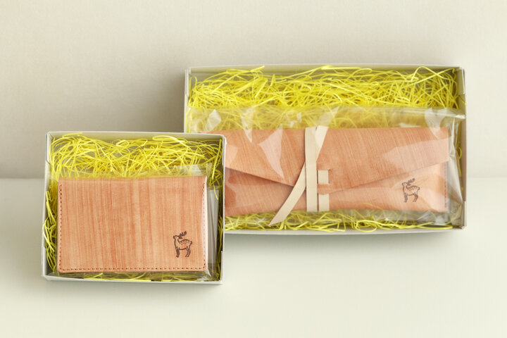 写真左は、ニコッと微笑む鹿のロゴマークがポイントの「柿渋染めの名刺入れ」。使うほどに馴染んでいく、レザーの素材感にも惹かれます。 「紐巻きケース」はメガネやペンのケースとして使うのにぴったりです。コンパクトにも収まるので、旅のレギュラーアイテムに。