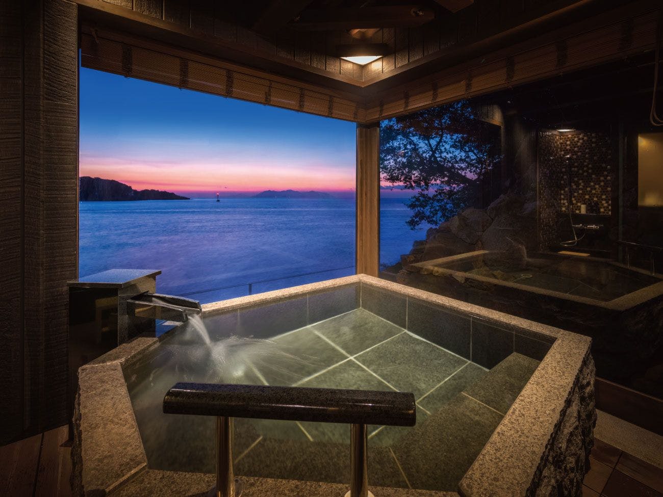 汀の宿「をちこち」ならではの絶景を堪能してほしいという思いから、客室はすべてオーシャンビューの温泉露天風呂付きに。夕食では、目の前に広がる海で上がったばかりの瀬戸内の幸を楽しむことができます。その時期いちばん美味しい魚介を選りすぐったメインディッシュをはじめ、素材を活かした料理旅館ならではの繊細な味わいを堪能して。
