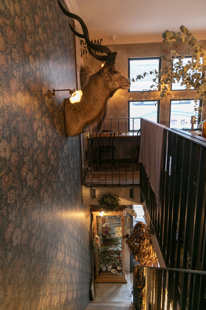2階に上がると、カフェスペース「GRAND FLOOR(グランド フロア)」があります。階段の脇の壁には、見事な鹿のはく製が飾られていて存在感抜群。 テーブルや壁にドライフラワーが飾られていたり、鳥がコードをつかんで飛んでいるような陶器の照明もあったり、とてもすてきな空間が演出されています。