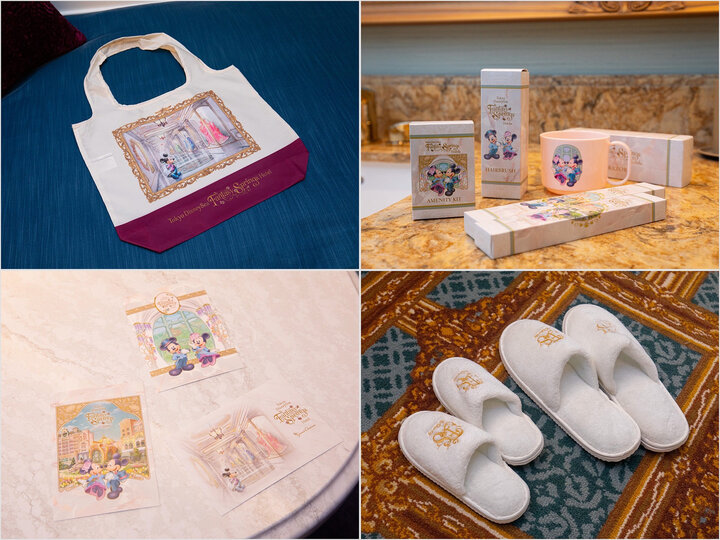 「グランドシャトー」の客室は全56室あり、東京ディズニーリゾートで最上級の宿泊体験を楽しめます。こちらは、3~5階にある「テラス&アルコーヴルーム」。立体感のあるモールディングや金箔が施されたカルトゥーシュなど、装飾の数々が滞在のひとときをリッチな気分に。トイレは2カ所あり、それぞれ壁紙が異なっているのでこちらもチェックしてみて。 グランドシャトーの客室にも、ミッキーマウスやミニーマウスがデザインされたエコバッグやポストカードなどのルームアメニティが用意されていますよ。