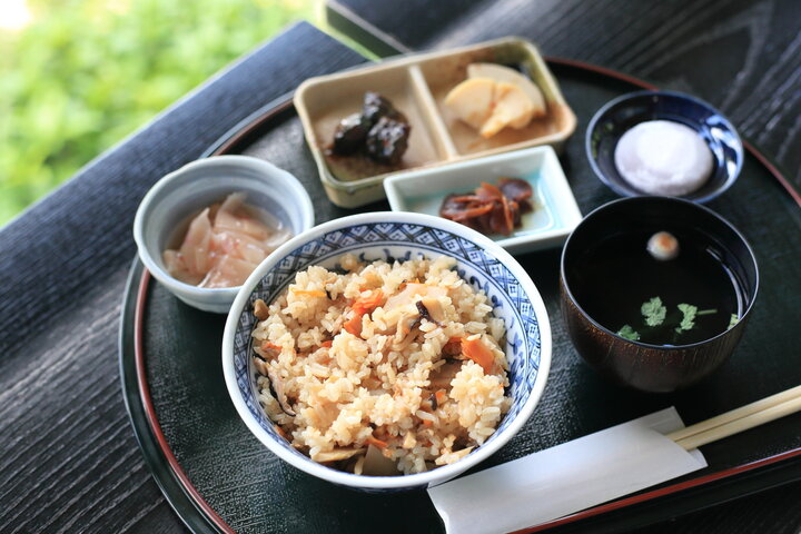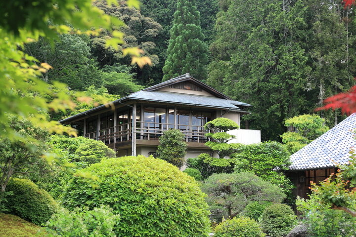 お食事は日本庭園を見下ろすように佇む「金鳳亭」へ。庭をめでられるように作られた日本家屋となっていて、窓が大きく、縁側にも出られるようになっています。欄干越しに見えるのは日本庭園と山の緑が一体となった立体感のある風景。山麓の庭園ならではの景色が広がっています。
