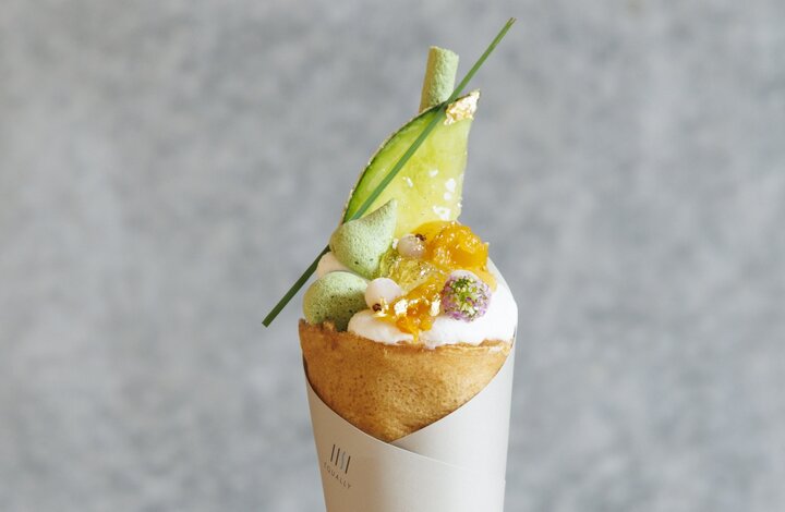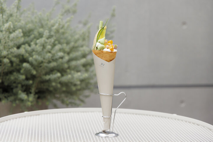 こちらに足を運んだらまず味わいたいのがクレープ。素材や製法にとことんこだわっているそう。生地の小麦粉はフランス産と国産の小麦粉をブレンドし、農家さん直送の新鮮なたまごと北海道産の牛乳、カルピス特選バターを使用。注文が入ってからフランスの鋳鉄製鉄板のクレープマシンで焼き上げ、鉄板の上でフランス産AOP発酵有塩バターを塗り込みます。 看板メニューは、月に1~2回の頻度で内容が変わる「季節のスペシャリティクレープ」。6月上旬は「クレープ・クラウンメロンシャンティ」(2860円)でした。 静岡産のフレッシュなクラウンメロンに甘すぎないバニラシャンティ(生クリーム)、さわやかなレモンジュレとレモングラス、エルダーフラワーのジュレ、アプリコットのジンとオレンジ煮がイン。京都宇治抹茶のメレンゲ、抹茶ホワイトチョコヘーゼルナッツクランチがトッピングされた、食べ続けるごとに味の変化がある楽しい一品です。