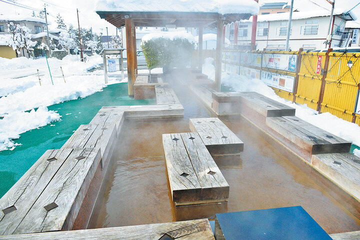 「ポケットパーク足湯」は、誰でも無料で利用できます。のんびり浸かって疲れを癒して。