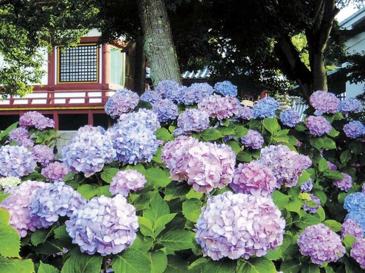 世界遺産・法隆寺も近い大和郡山市の矢田山の中腹にある「矢田寺(やたでら)」。日本のお地蔵さま発祥の地ともいわれる古刹で、1300年ほど前に開かれた真言宗のお寺です。 1965年ころから植え始め、現在は約1万株を数えるあじさいの名所。5月中旬から9月ころまで、約60種が2万5000㎡の境内に次々と咲きます。斜面を彩る姿や建造物との競演など、さまざまな景色を楽しめるのも魅力。2024年5月25日〜6月30日はあじさい園も開園します。