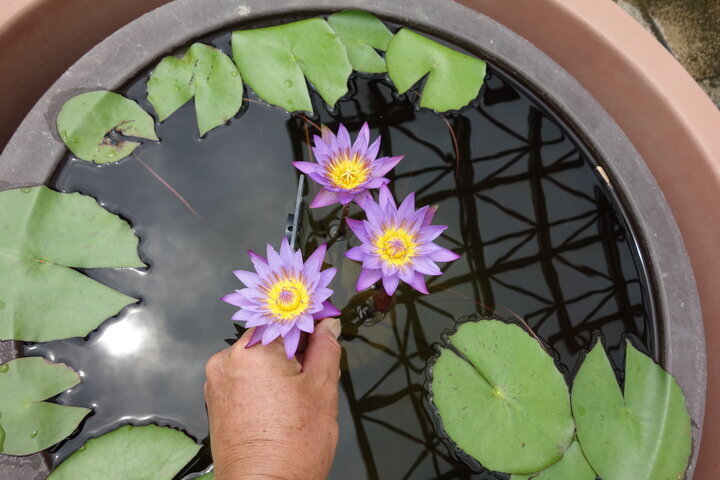 熱帯スイレン「紫式部」は、通常のスイレンよりもひとまわり小さい、直径3cm~6cmのミニスイレンとして育てたものを展示します