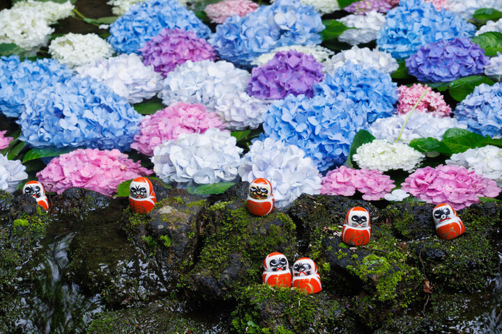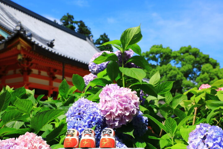 「勝尾寺」は箕面市北部の山岳地帯にある箕面国定公園の中心に位置し、四季折々の植物が愛でられる山寺としても有名。6月上旬~7月中旬までは、アジサイが見頃を迎えます。ヤマアジサイ、ガクアジサイ、タマアジサイといった、さまざまな品種のアジサイが色とりどり咲き誇ります。