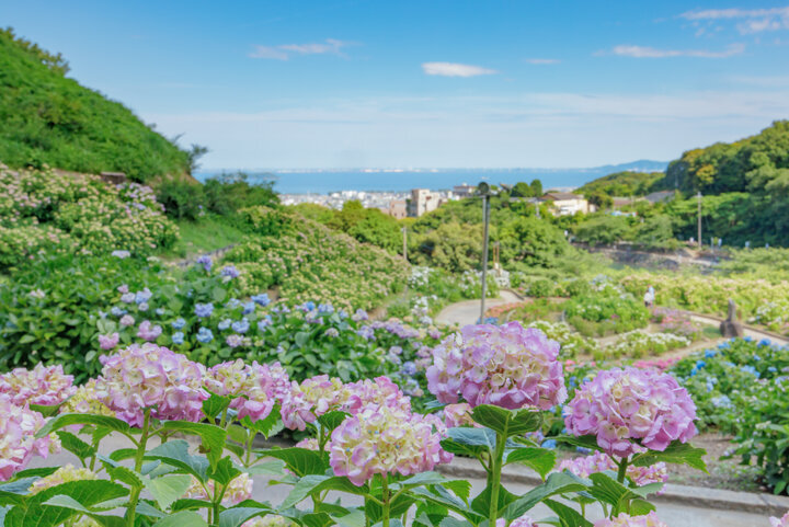 愛知県蒲郡市にある「形原温泉 あじさいの里」では、6月30日までの間、あじさい祭りが開催されています。約5万株のあじさいが咲き誇り、毎日ライトアップも行われる愛知県内有数のあじさいの名所。多彩なあじさいが植栽された斜面やガーデン、鯉が泳ぐ広々とした池、売店や休憩所などもあり、散策する楽しみも豊富です。あじさいでいっぱいの景観を楽しみに出かけてみませんか。