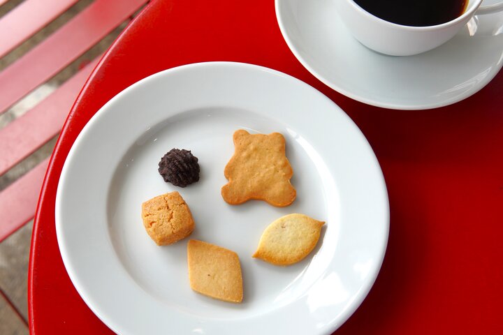 ガラス瓶に入ったクッキーは、量り売りで一枚から購入できます。クマの形をしたはちみつ味やシェル型のココア、ひし形のメープルなどに季節の味が加わって常時約6種類。さっくりとしたクセのない美味しさを、ハンドドリップで淹れるコーヒーと一緒に味わって。