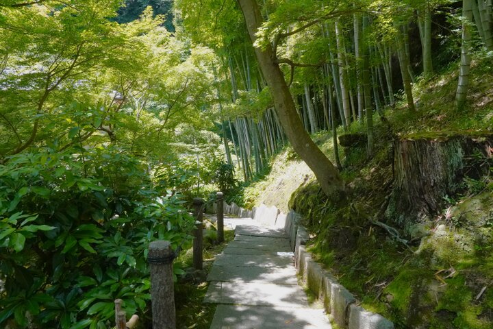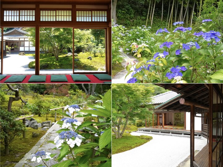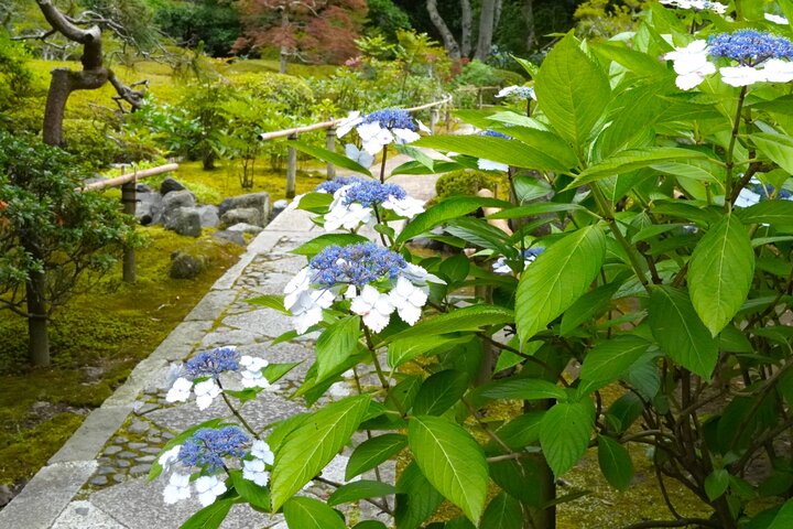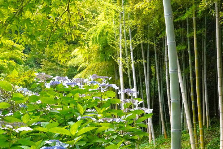 小径を進むと見えてくるのは竹林です。境内は奥行きがあり、この時期は竹林とモミジが勢いよく枝葉をのばす中に、アジサイが咲きそろいます。竹林のさらに奥にもアジサイが自生していて、ピンクや青色の花が山肌を彩ります。