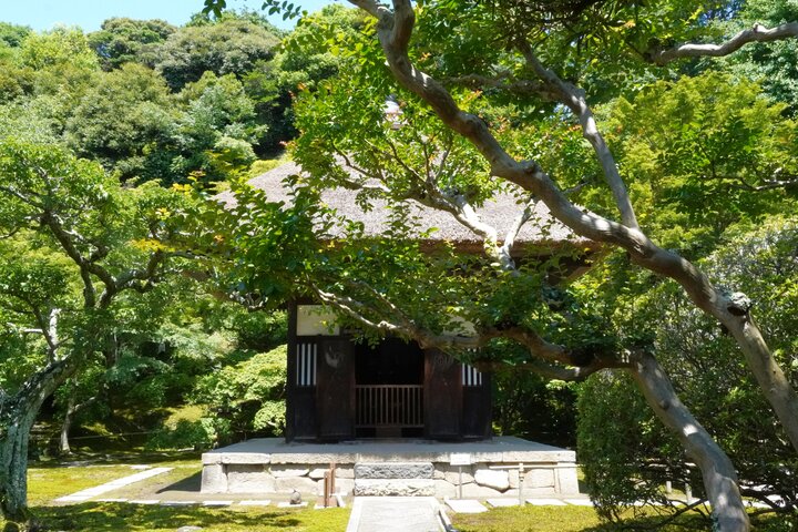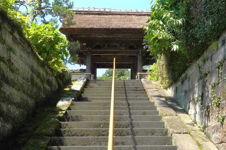 臨済宗建長寺の塔頭(たっちゅう)寺院の「長寿寺」は室町幕府の初代将軍として知られる足利尊氏が創建し、古先印禅師が開山したお寺です。階段を上った先には風情のある茅葺きの山門があり、その奥に美しい庭のある境内が広がります。