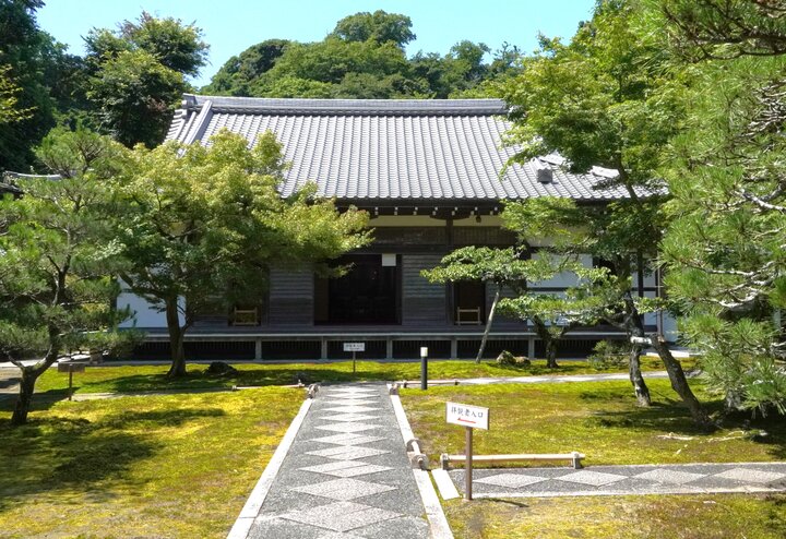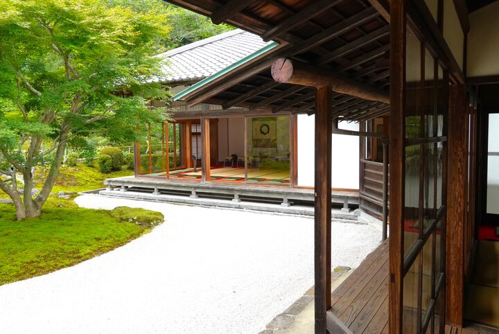 書院からさらに進むと小方丈へとつながります。小方丈では京都の庭師が手入れをする見事な枯山水の庭を眺めます。箒目(ほうきめ)と呼ばれる白色の砂で水面を表した模様が、この時期は涼やかに目に映ります。