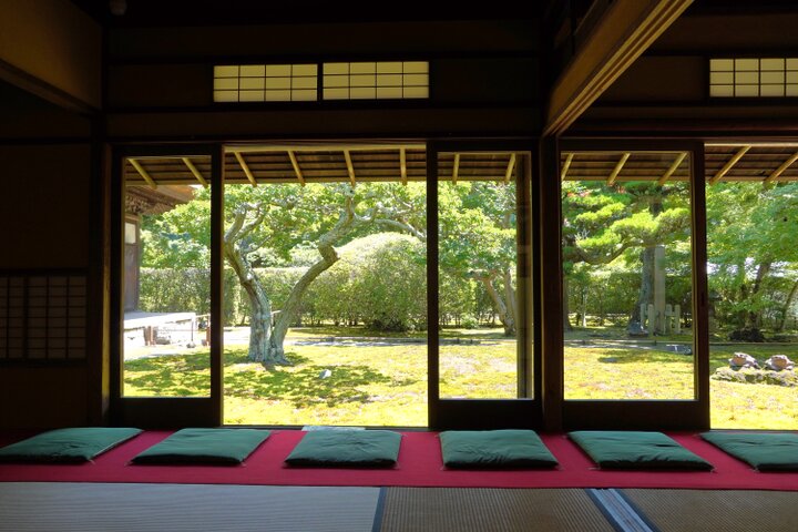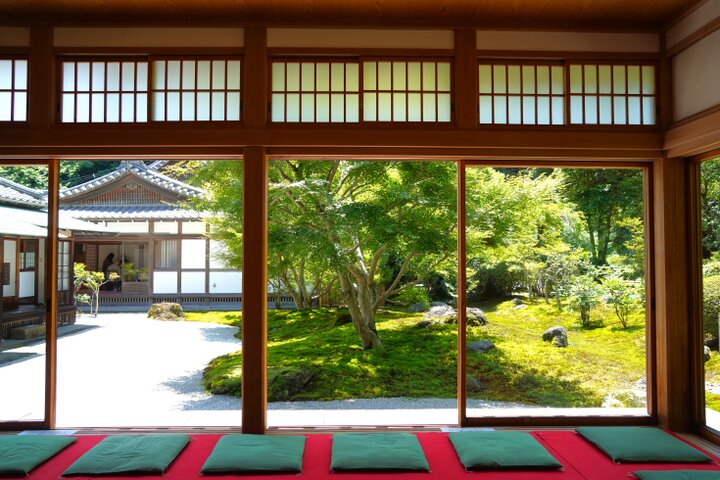 お参りを済ませたら廊下沿いに書院へと進みます。ここから先の書院や小方丈には、緋毛氈が敷かれ、座ってお庭を拝観することができます。 書院からは観音堂側の庭を望みます。この時期はモミジが枝葉をのばし、緑があざやかです。