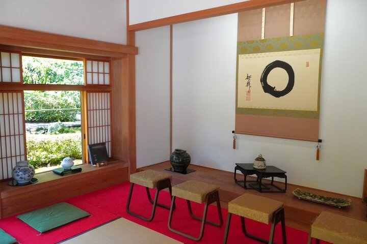 軸にかけられているのは「一圓相」という禅宗の教えです。力強い一筆書きで描いた円の意味は深く、無心になる、空になる、といった意味もあるそうです。実際に見るときっと何か感じるものがありますよ。