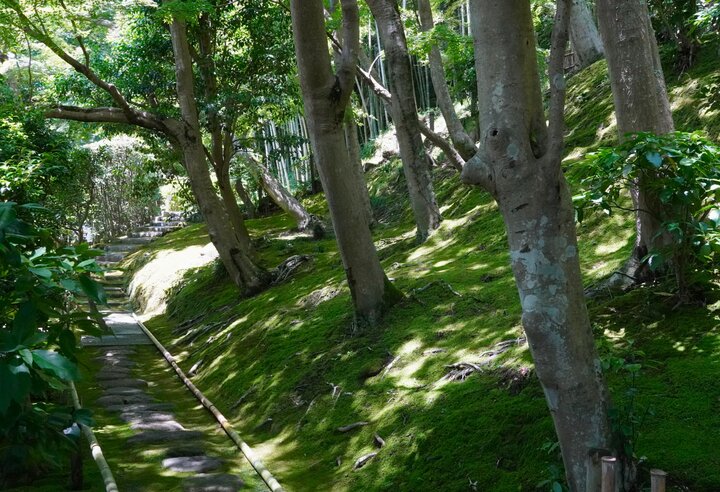 観音堂の裏手には木々が生い茂り、木陰となった木の根元には美しい苔が絨毯のように広がります。さらに階段をのぼると足利尊氏の墓があり、遺髪がおさめられています。