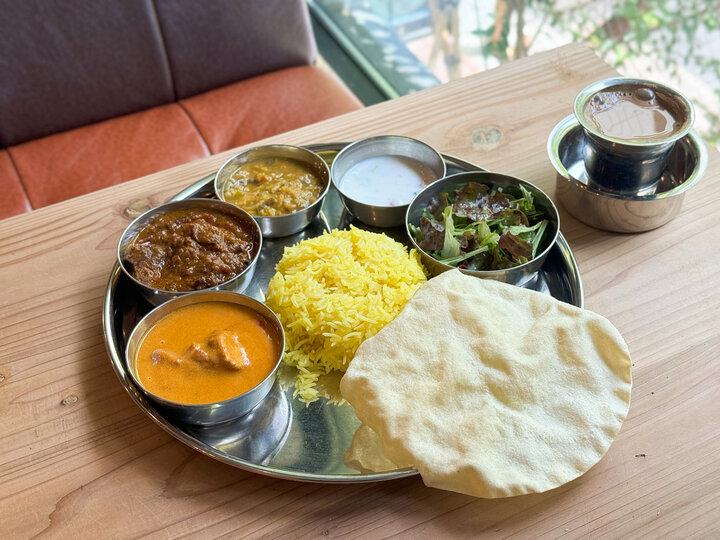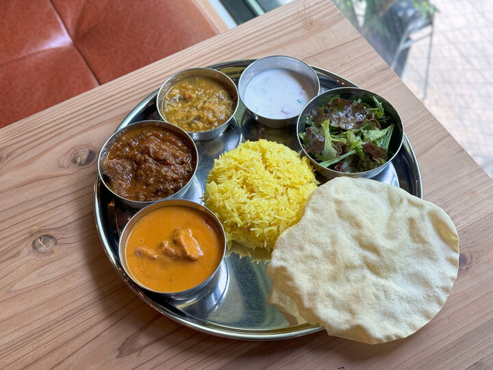 ランチやディナーで楽しめるカレーは「1CURRY SET」と「THALI SET」の2種類があり、カレーは「ビーフカレー」「ポークカレー」「バターチキンカレー」「野菜カレー」「ほうれん草キーマ」「鯖のカレー」の6種類から選択できます。おすすめは、カレーが2種類選べる「THALI SET」。 特に女性には、マイルドで程よい甘さが感じられる「バターチキンカレー」や、カレーの風味を引き立てる鯖を使用した魚のカレーが人気。