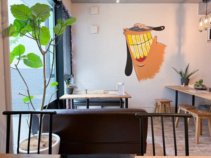 壁のユニークな犬の絵はオーナーの友人のフランス人アーティストJEREMY YAMAMURAさんが描いたもの