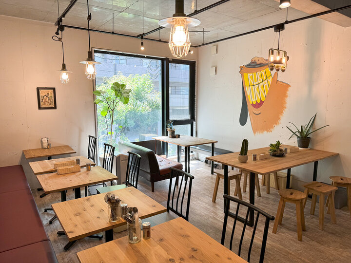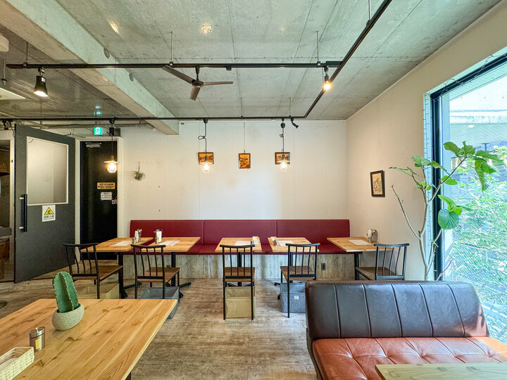 入口の扉を開けると、大きな窓から明るい光が差し込む温かみのある空間が広がっています。木のぬくもりが感じられるナチュラルな色合いのテーブルは、オーナーの宮田謙さんがDIYで手作りしたもの。 ランチタイムにはカリーセットや不定期でビリヤニ、夜はダイニングバーとしてアルコールと一緒に本格的なインド料理を楽しむことができます。