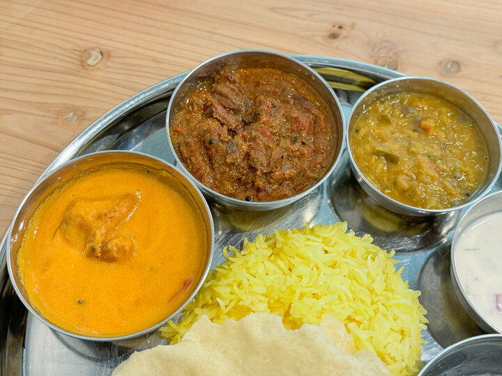 「バターチキンカレー」は、スパイスでマリネした鶏のもも肉をタンドール窯で焼いて、玉ねぎとトマト、生クリームで煮込んだバターチキンのソースに入れたもの。牛乳とトマトで煮込んだルーに肩ロースのブロックが入った「ビーフカレー」は、スパイシーな風味がありながら味はまろやか。大きな牛肉がゴロゴロ入っているので食べ応えがありますよ。 そのほか、オクラがたっぷり入った「豆と野菜のココナッツカレー」や、薄いおせんべいのようなアッパラムのパリパリ食感を楽しみながら、ターメリックライスと一緒に食べてみて。