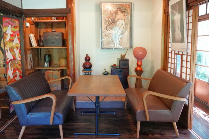 アルフォンス・ミシャのポスターが不思議とあう床の間の前にはゆったりとしたソファ。古民家の和の雰囲気にミシャの優美なアートがマッチして、柔らかい空気が漂います。