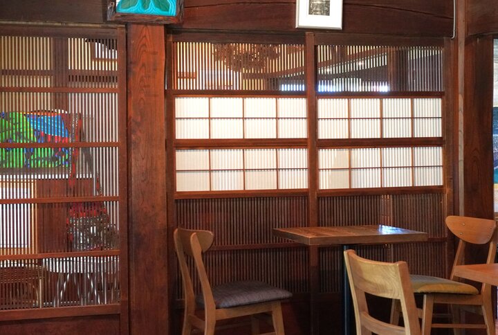 このカフェにいると建具も日本の四季と使い勝手を兼ね備えた様々な種類があることに気づきます。カフェスペースの入り口にはめられているのは、大阪格子戸と呼ばれる格子戸と障子の2重構造の格子戸。障子は必要に応じて取り外すことができ、夏は取り外して風通しを良くして涼しく、冬は障子をはめて温かく過ごすことができる仕組み。先人の知恵と工夫に脱帽です。