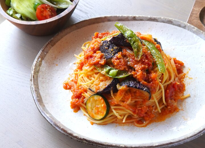 鎌倉駅前で“レンバイ”として親しまれている鎌倉農協直売所で仕入れる新鮮な鎌倉野菜を使った「鎌倉野菜のトマトソースパスタ」もおすすめの一皿。みじん切りにしたタマネギとニンニク、ニンジンと一緒にコトコト煮込んだトマトソースがアルデンテのパスタによく絡み、旬の鎌倉野菜の味わいも楽しめます。