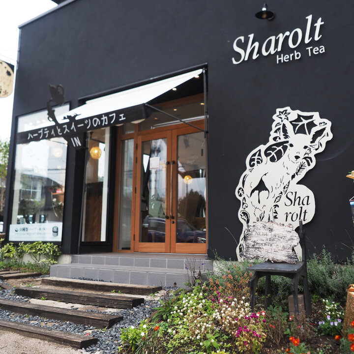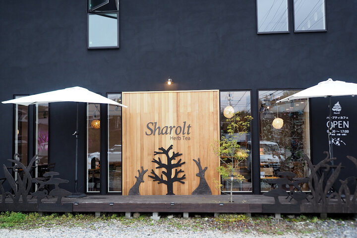 中軽井沢駅から国道146号線を北に進むこと約5分。軽井沢の人気観光スポット「ハルニレテラス」からすぐの場所に「Sharolt herb tea」はあります。モノトーンの建物に映える、つぶらな瞳の鹿さんが見えたら、ここが旅の目的地。