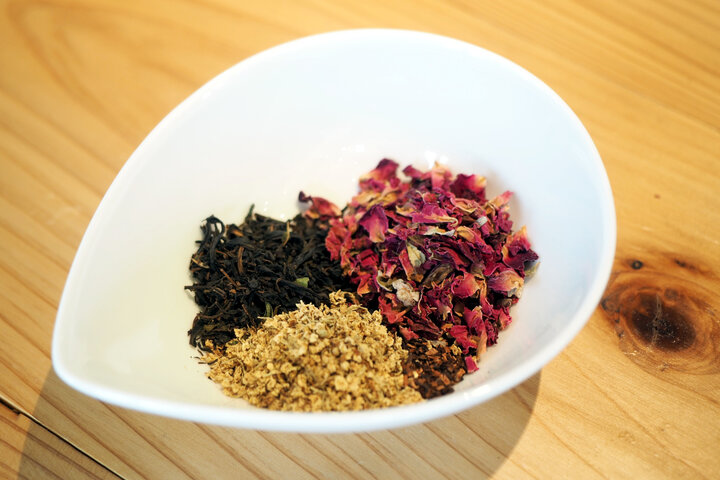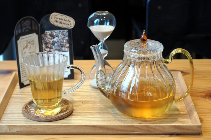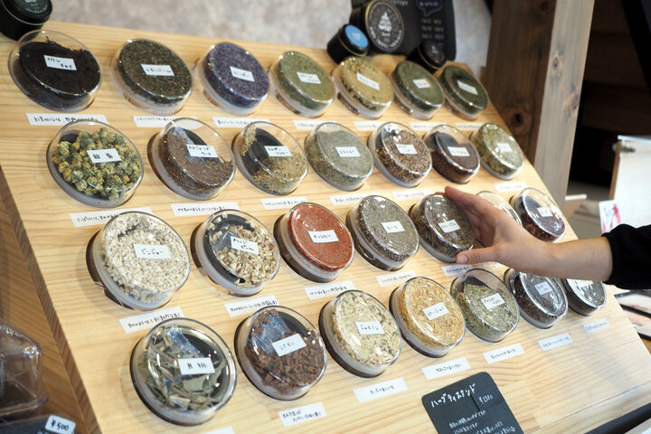 ここに来たら、ぜひ試したいのが、全28種類の中から選んでブレンドする「ハーブティスタンド」。予約は不要。気軽に自分だけのオリジナルブレンドティを作れます。 使用するのは、世界各国から取りそろえた28種類のハーブティ。私たちがよく知る、ジャスミンやラベンダーなどメジャーなものから、胎菊(たいじゅく)やネトルと言った珍しいハーブも並びます。