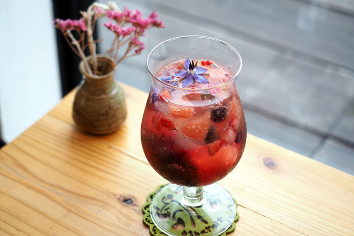 見た目もフォトジェニックなこちらは、ベリーやエディブルフラワーを入れたハーブティ「キューフラ フルーツ ゼリーティー」。グラスの下にはゼリーが入っていて、見た目の華やかさとつるんとした食感を楽しめます。