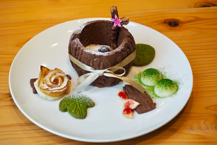 そして、軽井沢の「思い出の森」をイメージした「軽井沢の森 シャルロットケーキ」は、このお店のスペシャリテ。運ばれてきた瞬間、「かわいい!」と思わず声を上げてしまう、ガーリーな魅力にあふれています。 プレートを彩るのは、軽井沢に群生する「ハルニレ」の木や苔むした石、ローズガーデンのバラ、表情豊かな葉っぱたち。すべてが手づくり、丁寧に作り上げられたスイーツは、最後のひと口までワクワクが止まりません。