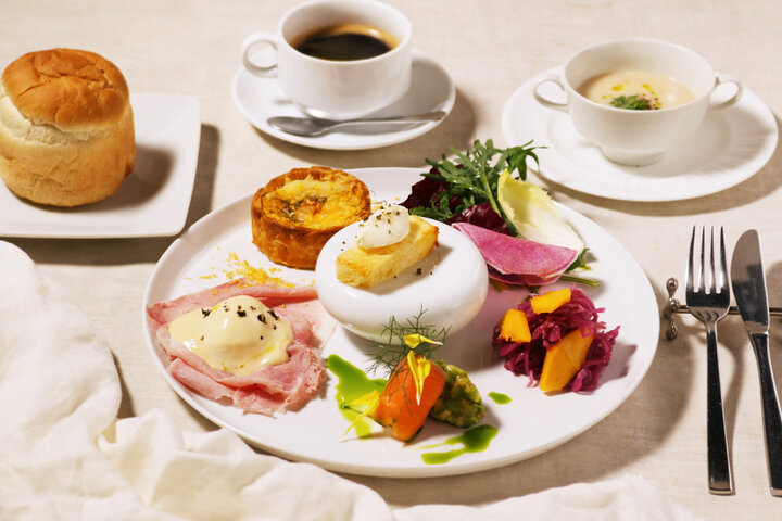 また、明治期(1894年)に銀行営業室として利用された空間を復元したミュージアムカフェ・バー「Café 1894」も、2024年11月23日より営業を再開しました。クラシックな趣と、2層吹き抜けの高い天井が人気のお店です。 店内のクラシックな設えはそのままに、現代的な感覚を意識しメニューをリニューアル。英国で古くから愛されるフィッシュ&チップスをはじめ、伝統的な洋食メニューに新しさとオリジナリティを加えた味わいを堪能することができます。 人気のランチメニューだった「ガーデンプレート」は、装いも新たに生まれ変わりました。その名も「パレットプレート」。画家たちのパレットをイメージした彩り豊かなオードブルに、季節の野菜のポタージュ、温かいパンがセットになっています。