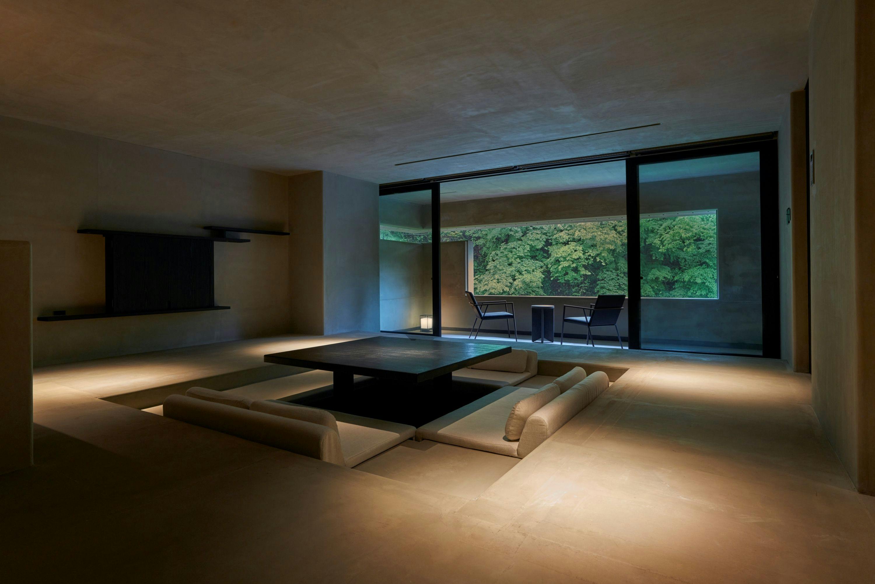 2024年にリニューアルしたLounge Chair Collection Roomは、名作家具に身を委ねながら、鶴仙渓の渓谷美、木々の移ろいを心ゆくまで楽しむことができます。岩盤をそのままに、天然素材で仕上げ、グレーチングをアクセントで配し、岩盤から湧き出る水への機能性とデザイン性を両立した空間です。