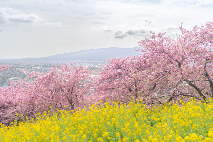 いちばんの目的地のしたいのが、「西平畑(にしひらはたけ)公園」。富士山や足柄の山々、小田原城や伊豆大島まで見渡す大パノラマが楽しめます。四季折々に美しい花が咲き、ハーブガーデンやミニSLなど楽しい施設もいっぱいのこちら。今の時期は河津桜や菜の花が見ごろです。2026年は2月7日から3月8日まで「まつだ桜まつり」が開催されます。