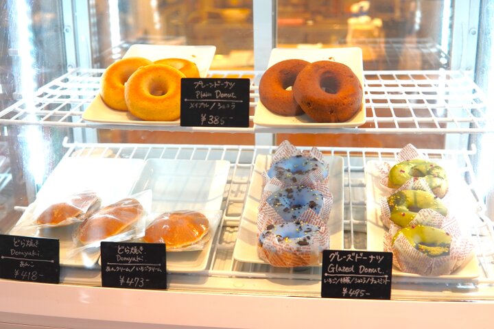 ショーケースには抹茶やチョコミントなどのグレーズドーナツや、どら焼きなども並びます。イートインではこうしたスイーツのほかにも、テリーヌショコラやソフトクリームをラインナップ。テイクアウトにも応じてくれますよ。