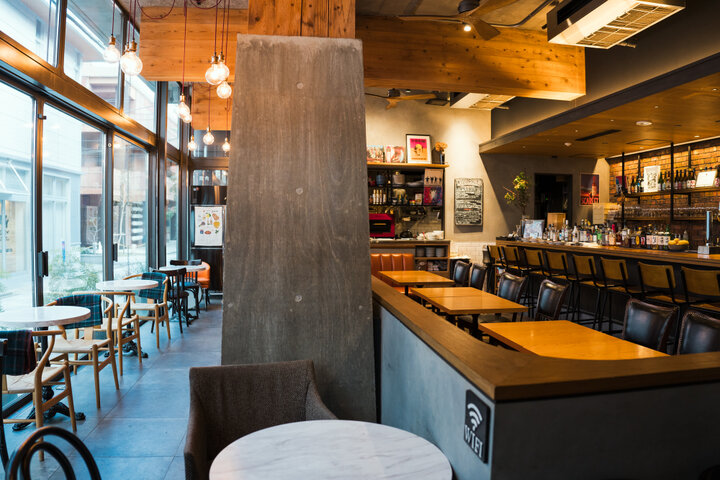 茶色を基調としたおしゃれで落ち着いた雰囲気の店内はひとりでも楽しめるバーカウンターや仲間と利用できるテーブル席を配置。春から夏にかけて気持ちの良い季節には、道路に面した一面のガラス張りが開放され、窓際席が外テラスに変身。自然の風を感じながら優雅にお食事を楽しめます。